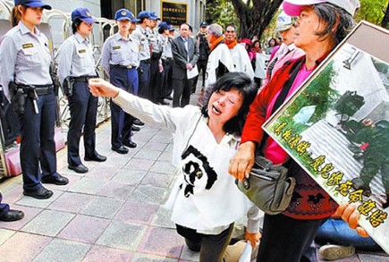 中新網3月25日電 據臺灣媒體報道,臺空軍一中士蔡學良于前年五月九日在靶場射擊時遭槍傷后不治身亡,被判定是自殺,蔡母尤瑞敏率親屬到空軍司令部前拉白布條抗議,痛批空軍“草菅人命、黑箱作業、毀滅證據”,蔡母倒地痛哭:“司令,我給你跪,拜托你給我們一個真相,不要再敷衍了!”隨后并向“監委”趙昌平陳情,趙允諾調查,近期內將約談相關人員。