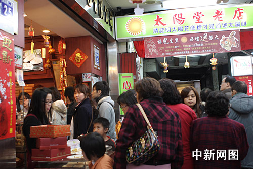 中新網(wǎng)臺中2月22日電 (屈運(yùn)栩)初到臺中的人,一定會被路兩旁零次櫛比,目光應(yīng)接不暇的“太陽堂”招牌和店鋪吸引。店鋪里售賣的太陽餅是臺灣最有代表性的特產(chǎn)。春節(jié)剛過,記者走訪了臺中太陽餅老店鋪?zhàn)罴械淖杂陕,看到各間老餅鋪前都排起長隊,一片生意興隆景象。