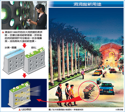臺大校園規劃小組召集人劉聰桂昨天指出,為推動“改善椰林大道計劃”,決定將洞洞館墻重新利用,制成移動式LED分隔島,提供椰林大道交通分道、綠化及照明等功能,“讓‘洞洞館’再生”。