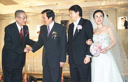 結(jié)婚酒會(huì)由吳伯雄證婚,馬英九貴賓致詞,馬英九以最夯的廣告詞“殺很大”,期勉新郎至少要生三個(gè)以上。馬英九也詢問新人婚后是否定居島內(nèi),當(dāng)馬英九得到肯定答案后,隨后竟爆出“那就歸我管了”,讓現(xiàn)場笑翻天。