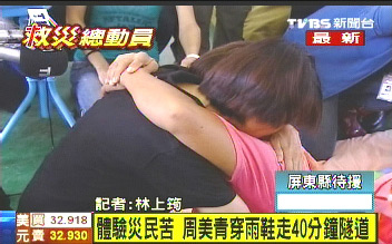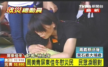 周美青努力安撫每位災民,好幾位民眾一度都忍不住放聲哭泣,和周美青相擁在一起,周美青也緊緊的抱著他們,心情也跟著難過。