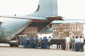 美軍機組人員逐一把標示著“美國陸戰(zhàn)隊”四大箱的防水布推到卡車上,臺灣空軍再把這批物資轉交給到場的聯(lián)勤租用貨車。聯(lián)勤官員表示,這批防水布物資將載到嘉義、高縣旗山與臺東等地災區(qū)使用。