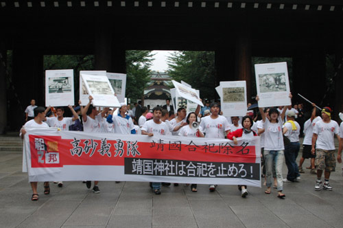 8月11日,高金素梅一行于上午9時30分左右搭車出其不意地抵達(dá)靖國神社,隨即高舉“要求靖國還我祖靈”等大型橫布條標(biāo)語,浩浩蕩蕩地列隊走向靖國神社的正殿,并高喊口號。靖國神社的警衛(wèi)人員前往阻擋,企圖奪走標(biāo)語布條,雙方發(fā)生肢體沖突。
