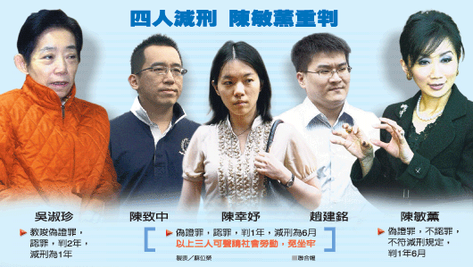 中新網9月2日電 據臺灣《聯合報》報道,陳水扁女兒陳幸妤、女婿趙建銘、兒子陳致中因偽證罪被判刑六月,雖不能易科罰金,但可以易服社會勞動。檢方表示,未來原則上會核準趙建銘、陳幸妤聲請義診替代服刑,但法律勞務暫不需要,因此陳致中可能被安排清潔小區。