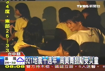 中新網(wǎng)9月8日電 據(jù)臺灣TVBS報道,臺灣921地震十周年,馬英九夫人周美青,7日下午以“周老師”的身份,陪當(dāng)年的災(zāi)童看紀(jì)錄片。