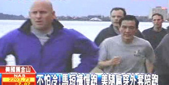 報道稱,馬英九真的是不怕冷,在舊金山陰雨綿綿、又濕又冷的清晨,馬英九則是穿著小短褲的招牌慢跑勁裝出現。
