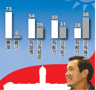 中新網5月19日電 據臺灣《聯合報》民意調查發現,臺灣民眾印象中的馬英九是一個廉潔、誠信、有能力,但缺乏魄力的領導人;整體來看,馬英九獲得58%民眾的信賴。