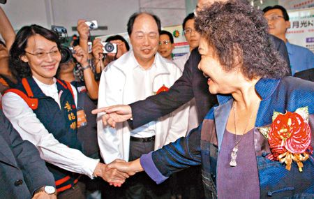 黃昭順、侯彩鳳“立委”先到陪著吳敦義,后來趕到的陳菊與吳敦義握手后,接著主動與黃昭順握手并稱“黃委員”,黃則回以微笑。