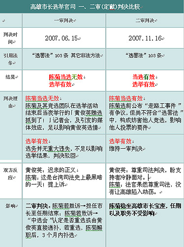 中新網11月16日電 高雄市長選舉官司二審今天下午二審宣判,改判陳菊當選有效,選舉無效之訴仍維持一審判決予以駁回,全案定讞。被告陳菊及原告黃俊英都未到庭聆判。