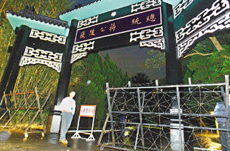 兩蔣陵寢昨天下午撤哨,撤哨后,慈湖陵寢入口處立即擺上拒馬,管制人車進入。(臺灣聯合報圖)