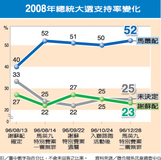 在支持度方面,擁護(hù)馬蕭的民眾由十月下旬的五成上升到五成二;力挺謝蘇的人則由兩個(gè)月前的二成五降至二成三;至于未決定的比率,仍維持在二成五。