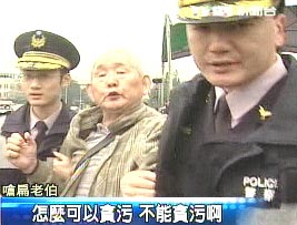 陳水扁在會上依舊鼓吹推動“入聯(lián)公投”,但沒想到臺下卻有民眾嗆扁,嗆扁民眾隨即被警察帶走;但又有民眾高喊:“阿扁下臺!”嗆扁老伯念念有詞:“怎么可以貪污,不能貪污啊!”老伯隨后同樣也被架走。(高大林)