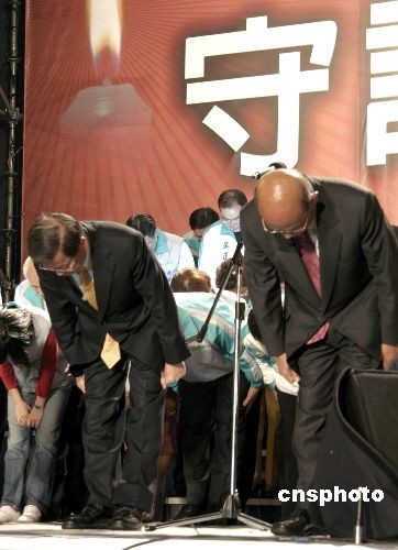 中新網3月22日電 據臺灣東森新聞報道,民進黨輸掉2008年“大選”,謝蘇配大敗,得票與對手馬蕭相差超過220萬票,謝長廷7點半上臺,向支持者致歉和致謝。