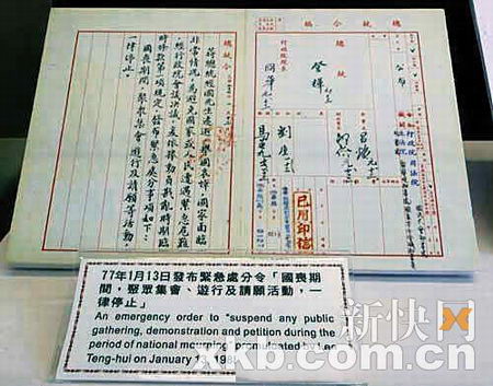 臺“總統(tǒng)府”9日上午開放民眾參觀,展覽室內(nèi)展出歷任“總統(tǒng)”文物及公文稿,據(jù)臺灣媒體9日報道,其中包括1988年蔣經(jīng)國逝世時,馬英九受命用毛筆撰寫的緊急處分令真跡,規(guī)范在“國喪”期間,全臺禁止聚眾集會、游行、請愿等活動,當(dāng)時馬英九是“總統(tǒng)府”第一局副局長,簽出來的文稿還要層層上報,由長官批示,最后由繼任“總統(tǒng)”的李登輝批定。