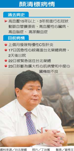 經治療后,顏清標目前已經穩定。醫師稱顏清標病情復雜,治療有困難,需住院治療一周,之后是否能服刑,還得觀察。