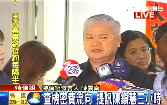 據臺灣TVBS報道,特偵組偵辦扁家海外密賬動作頻頻,今天再借提兩位在押被告陳鎮慧、林德訓到案。特偵組發言人陳云南表示,今天最主要是要厘清機要費的細節部分,陳鎮慧所經手的總金額,到底正確數字為何,檢察官已在進一步厘清當中。