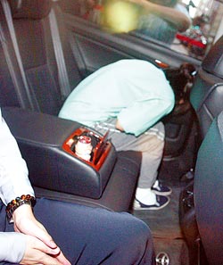 臺灣檢方特偵組14日提訊在押的前陳水扁任內(nèi)辦公室出納陳鎮(zhèn)慧及陳水扁辦公室主任林德訓(xùn)厘清案情;陳鎮(zhèn)慧還押看守所時在車內(nèi)彎腰閃避媒體鏡頭。(圖:臺灣《中國時報》)