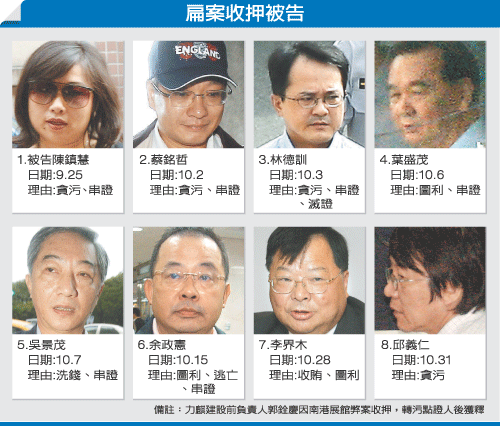 目前陳水扁弊案中,最早被收押的是卷入陳水扁家庭洗錢疑案的力麒建設公司負責人郭銓慶,他在9月12日,就因被臺北地檢署查出另涉世貿南港展覽館興建工程行賄標案評選委員弊案,檢察官傳喚他到案,向臺北地方法院聲請羈押禁見獲準。