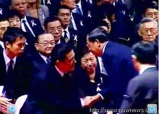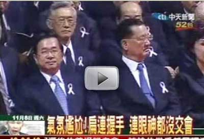 此時(shí),馬英九起身回禮,扁、馬短暫交流,隨后陳水扁和“副總統(tǒng)”蕭萬長夫人朱俶賢及“前副總統(tǒng)”連戰(zhàn)也握手致意,但馬英九之前見陳水扁上前還禮貌起身,相形之下,朱俶賢與連戰(zhàn)則是坐著握手,一旁的連方瑀連看都不想看陳水扁。