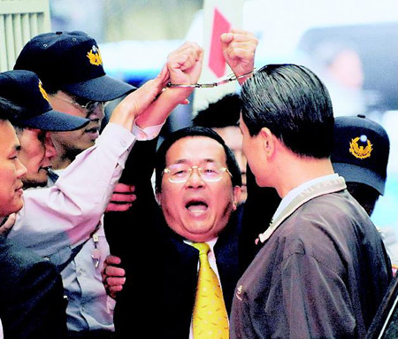 進(jìn)入特偵組7個(gè)小時(shí)后,特偵組以海外洗錢(qián)案、“機(jī)要費(fèi)”貪腐案涉嫌貪污、收賄等四項(xiàng)罪名,正式向臺(tái)北地方法院聲請(qǐng)收押陳水扁。下午4時(shí)20分,陳水扁步出特偵組,來(lái)了一個(gè)“最后政治秀”。他墊起腳尖,高舉銬著手銬的雙手長(zhǎng)達(dá)17秒,高喊“政治迫害”“司法冤獄”“臺(tái)灣加油”等口號(hào),“從容就義”登上警車(chē)。