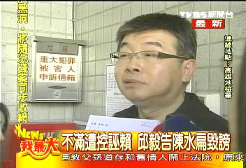 邱毅日前指陳水扁利用專機,把巨額款項運送到帕勞分行,陳水扁辦公室反駁是胡亂指控,邱毅4日南下高雄地檢署,控告陳水扁。圖片來源:臺灣TVBS