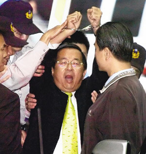 陳水扁被收押高舉手銬的一幕。圖片來(lái)源:臺(tái)灣《聯(lián)合晚報(bào)》