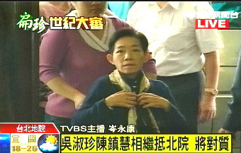 中新網3月17日電 據臺灣TVBS報道,17日下午2點24分,陳水扁夫人吳淑珍穿著藍色針織毛衣,披著絲巾,在兒子陳致中的陪同下,進入法院。陳鎮慧則是戴著大墨鏡,白外套、黑上衣,低調進入法院。今天首次進入實質審理,雙方對質,備受注目!
