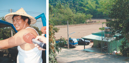 臺灣南部此時太陽正烈,邱義仁頂著艷陽在兩千多坪農地上來回巡,整地工人開著挖土機整地,他蹲在田里,拿著磚頭、鏟子松土,戴振耀不時湊過去“指導”,教他怎么把土翻松。