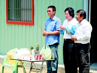 戴振耀陪邱義仁焚香拜拜,祈求風調雨順年年收成好;他說,前晚兩人聊種田的事聊到12點多,邱義仁對務農很有興趣。