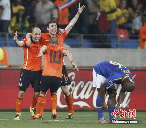 中新網7月2日電 今晚22:00,南非世界杯進行了1/4決賽的首場比賽,由荷蘭隊在伊麗莎白港的曼德拉灣球場迎戰巴西。雖然羅比尼奧在上半場率先破門,但下半場憑借梅洛的烏龍球和斯內德頭槌建功,荷蘭隊2-1逆轉擊敗巴西隊,率先挺進四強。