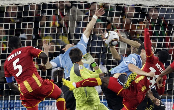 加納隊與烏拉圭隊的世界杯1/4決賽,可謂是一波三折。在加時賽的最后關頭,加納隊險些攻破烏拉圭隊的大門,不過烏拉圭隊的前鋒蘇亞雷斯卻上演上帝之手,將皮球拍了出去。他的這個違反體育精神的舉動,卻給烏拉圭隊帶來了一線生機,在加納隊前鋒吉安罰丟點球后,烏拉圭隊在點球大戰中4比2淘汰加納。
