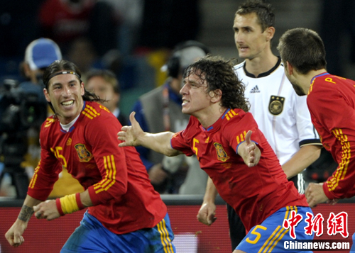 中新網7月8日電 今天凌晨2:30,南非世界杯第二場半決賽在德班球場拉開戰幕,由德國隊迎戰西班牙。憑借普約爾在第73分鐘的頭球破門,西班牙隊1-0力克德國,與荷蘭隊會師決賽。