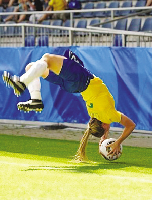 世界杯歷史第二號射手克洛澤的標志性動作就是進球后來個空翻,但這位叫莉亞的姑娘更牛,在17日巴西與瑞典的U20女足世界杯小組賽中,她表演了空翻擲界外球的絕技,滿座皆驚。