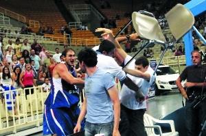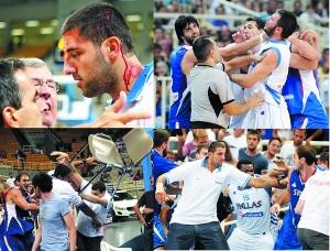 昨天的比賽臨近結(jié)束時,希臘隊當時以74比73領(lǐng)先塞爾維亞,隨后雙方兩名無球隊員產(chǎn)生口角,并發(fā)展成肢體沖突。而后發(fā)生了最殘酷的一幕,塞爾維亞隊隊長、效力于NBA雷霆隊的科斯蒂奇卷入沖突,他抓起一把椅子丟向比賽中與其對位的希臘隊中鋒肖特薩尼蒂斯,不料椅子卻擊中因傷坐在希臘隊替補席上的布魯西斯,后者頭部頓時鮮血直流。此后有多名球員卷入此次群毆事件,現(xiàn)場亂作一團。據(jù)美聯(lián)社報道,雙方后在球員通道內(nèi)再次發(fā)生斗毆。而就在這起惡性打架事件發(fā)生前6分鐘左右,塞爾維亞隊主帥伊夫科維奇因與主裁判發(fā)生沖突而被吹了兩次技術(shù)犯規(guī),最終被逐出場。