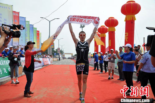 上午8點30分,隨著裁判員的一聲令下,運動員們躍入水中,你追我趕。322號選手黨琦以游泳賽第一的好成績率先沖上岸,而后不顧疲憊,駕駛著自行車沖出起跑線。經過40公里的長途奔襲,選手們多數體能耗半。頑強的運動員們發揮超人的意志繼續踏上跑步“長征”。當205號法國選手Tony Orvain以總成績2小時12分21秒第一個沖過終點時,現場觀賽人員掌聲、歡呼聲四起。