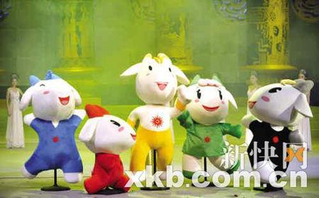 “五羊”是廣州市最為知名的一個標(biāo)志,以五只羊作為吉祥物,充分體現(xiàn)了東道國、主辦城市的歷史底蘊、精神風(fēng)貌和文化魅力。這五只羊有著與北京奧運會吉祥物“北京歡迎你”類似的名字,“阿祥”、“阿和”、“阿如”、“阿意”、“樂羊羊”組成“祥和如意樂洋洋”。