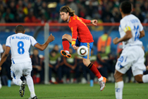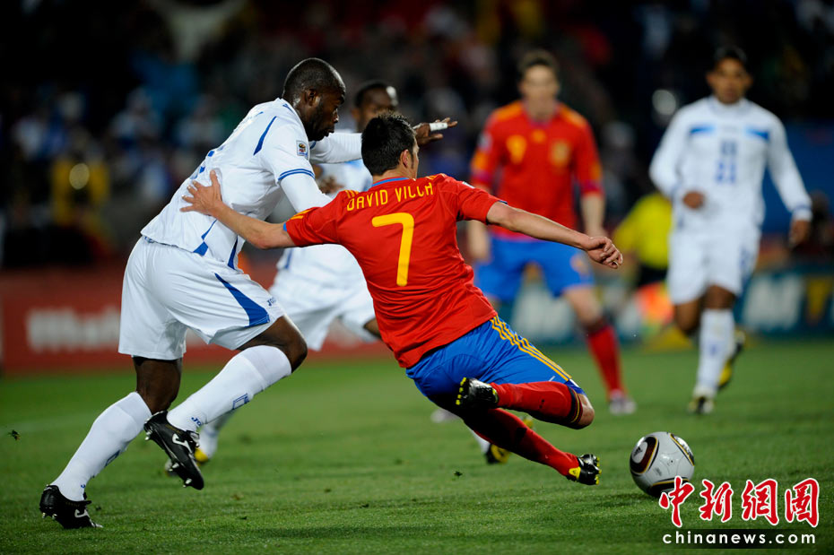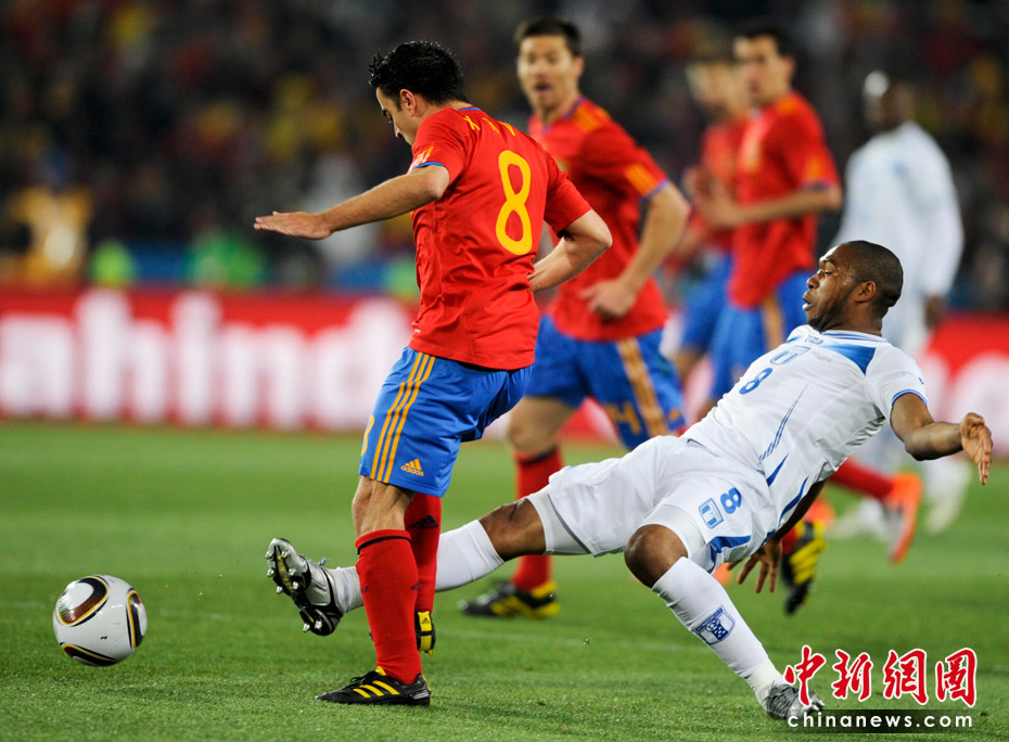 當地時間6月21日晚,南非世界杯小組賽第二輪西班牙對洪都拉斯的比賽在約翰內斯堡埃利斯公園體育場展開激烈的爭奪,最終西班牙2比0擊敗洪都拉斯 。 中新社記者 廖攀 攝