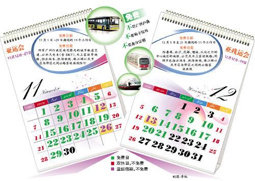 根據相關規定,在亞運會及亞殘運會機動車單雙號限行的46天里(11月1日至29日、12月5日至21日),剔除13個雙休日和3天新增假期后的30個工作日里,市民都可免費享受公共交通服務。有關部門預計,免費期間廣州每天將新增300萬人次的客流,高峰期可能出現“井噴”,請沒有剛性出行需求的市民注意錯峰出行。