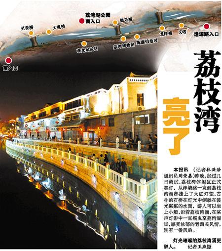 廣州日?qǐng)?bào)11月3日?qǐng)?bào)道 昨晚,經(jīng)過(guò)幾日調(diào)試,荔枝灣休閑區(qū)正式亮燈,從泮塘路一直到荔枝灣涌都掛上了大紅燈籠,古樸的石橋在燈光中倒映在波光粼粼的水面,游人可以坐上小艇,沿著荔枝灣涌,在槳聲燈影中一直搖曳至荔灣湖里,感受濃郁的老西關(guān)風(fēng)情,別有一番風(fēng)韻。
