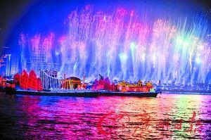 晚上6時18分,鑼鼓聲響起,龍獅起舞,舞臺燈光照亮,花船緩緩駛來。打頭陣的是獨具廣州特色的南海神·廣州日報號,在它的引領下,45個花船從三個碼頭依次駛出,勻速前行。