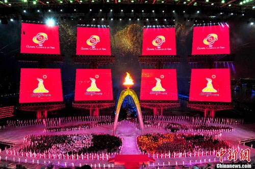 隨著中國總理溫家寶正式宣布亞運會開幕,整個會場和天空再次被無數絢爛的煙火照亮。