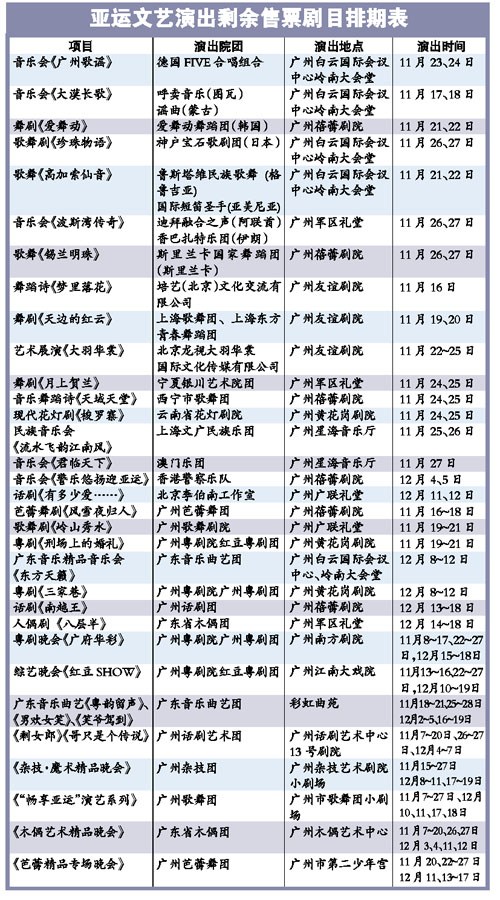 第16屆廣州亞運會已經進入第4個比賽日,亞運文藝好戲也正在上演,之前的演出幾乎是場場爆滿。據了解,亞運文藝演出還有少量余票可售,感興趣的是市民可千萬不能錯過。觀眾可以撥打總票房電話020-83567425、83566719進行咨詢和訂票,也可以登錄在網上訂票。