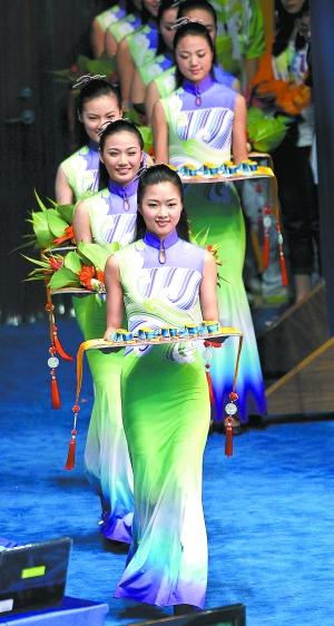 藍綠過渡的明亮色,將云水紋完美展示的同時,也將禮儀小姐們婀娜的身姿盡情展示。舉手投足間,禮儀小姐們顯得典雅而華麗。現(xiàn)場觀眾在把掌聲獻給獲獎運動員的同時,也將目光聚集在了這些禮儀小姐們的身上。