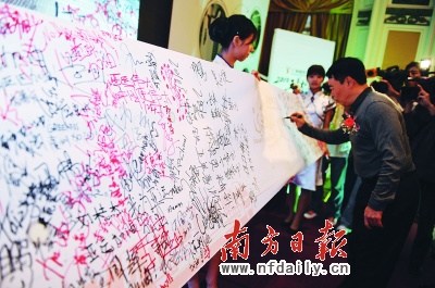 南方日報訊(記者/劉靜陳潔娜通訊員/葉子川)激情亞運,溫馨地鐵。昨天下午,廣州地鐵舉行了“2010五羊喜游記”成果發布會暨“亞運萬人助威卷軸”贈送儀式,把在地鐵站內收集的市民簽名與祝福轉呈亞運會組委會,表達市民支持亞運,祝福亞運的美好心愿。