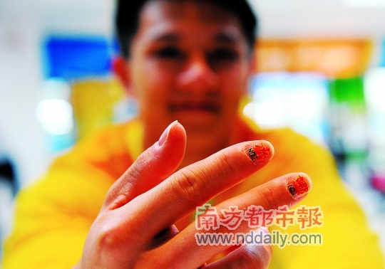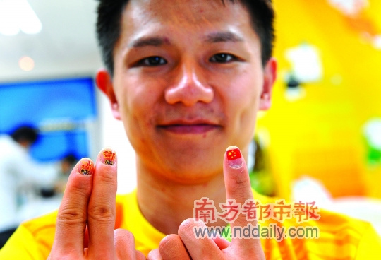 在陳琳將陳一冰指甲上的國旗和“冰”字稍作修補后,“他對我說,能不能再給我設計一個娜字,和這個冰一樣,涂在右手中指指甲上,說的時候還有點靦腆,但我一下子就明白了,就照這在他的指甲上圖上了一個大紅的‘娜’字。”陳琳說。