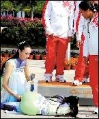 昨天,在龍舟女子1000米競速賽頒獎時,捧著銀牌的禮儀小姐因在烈日下長時間站立突然暈倒。