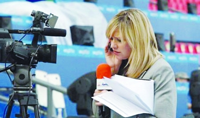 有劉翔的比賽,媒體也會為之瘋狂!在距離劉翔比賽還有3個多小時的時候,不少電視媒體已經在跑道一側搶占有利地形,進行采訪準備,這其中半島電視臺的美女主持人謀殺了不少菲林,她的風頭蓋過了熟悉劉翔的央視記者冬日娜,她告訴記者,今天是為劉翔而來!“我10天前來到廣州,但今天是我第一次來田徑賽場,除了卡塔爾的運動員,我最關注的就是劉翔!”