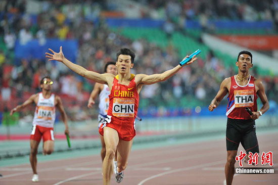 中新網11月26日電 在26日晚結束的廣州亞運會田徑男子4x100米接力決賽中,新科亞洲“百米王”勞義與陸斌、梁嘉鴻和蘇炳添組成的中國隊以38秒78的歷史最好成績奪得冠軍,20年之后再次奪得亞運會接力冠軍。