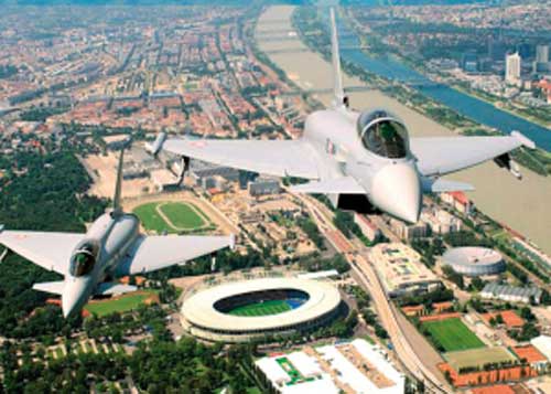奧地利空軍為確保歐洲杯期間主賽場的安全,派出最新裝備的EF2000“陣風”式戰斗機執行空中巡邏任務,以確保比賽的安全。