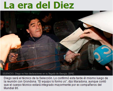 《奧萊報(bào)》以“10號(hào)的時(shí)代”為標(biāo)題,第一時(shí)間發(fā)表了這條消息。阿根廷時(shí)間10月28日下午,馬拉多納在和格隆多納面談后確定了自己將成為新的國(guó)家隊(duì)主教練。他說:“我將自己組建球隊(duì)。”同時(shí)他還表示,教練組將以他86年世界杯奪冠時(shí)的球隊(duì)成員為主,甚至當(dāng)時(shí)的冠軍主帥比拉爾多也有可能再度出山,輔佐愛徒。